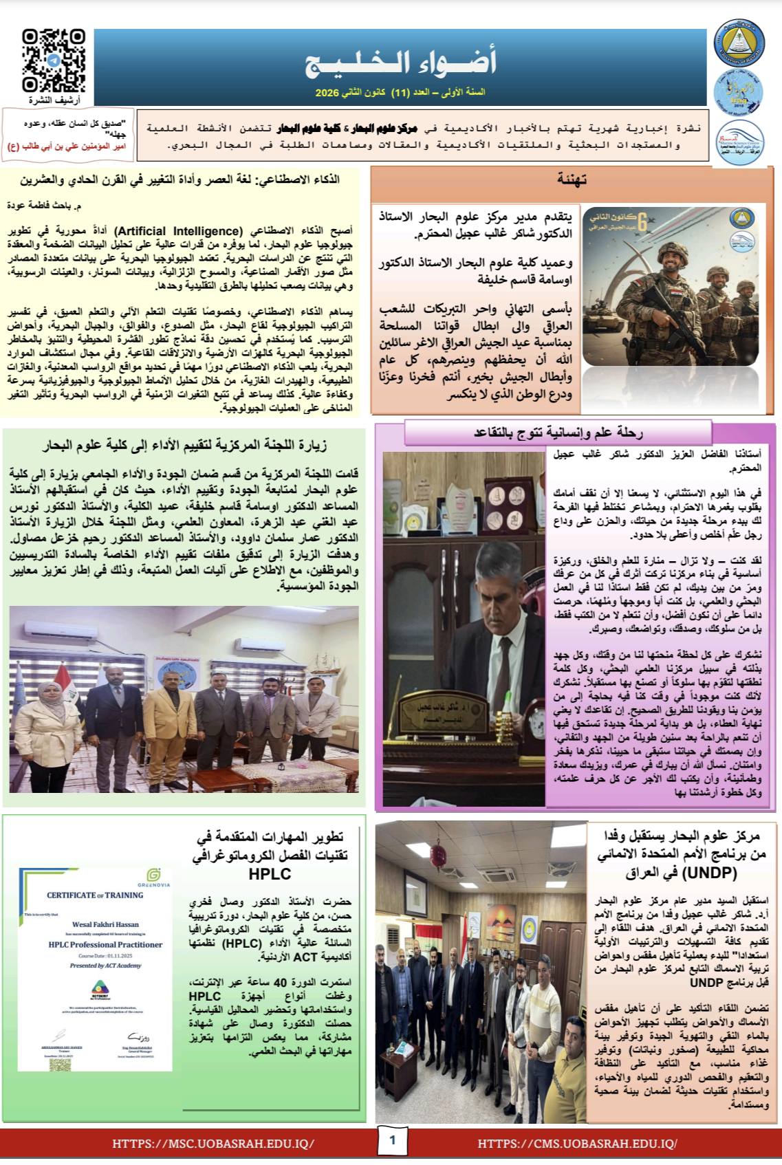 من أجل دعم خطط التنمية المستدامة في الحفاظ على التنوع البحري أصدر مركز علوم البحار وكلية علوم البحار في جامعة البصرة العدد الحادي عشر من النشرة الشهرية (أضواء الخليج) التي تهتم بالانشطة العلمية والمقالات والمستجدات البحثية والملتقيات الاكاديمية فضلاً عن مساهمات الطلبة المتنوعة.