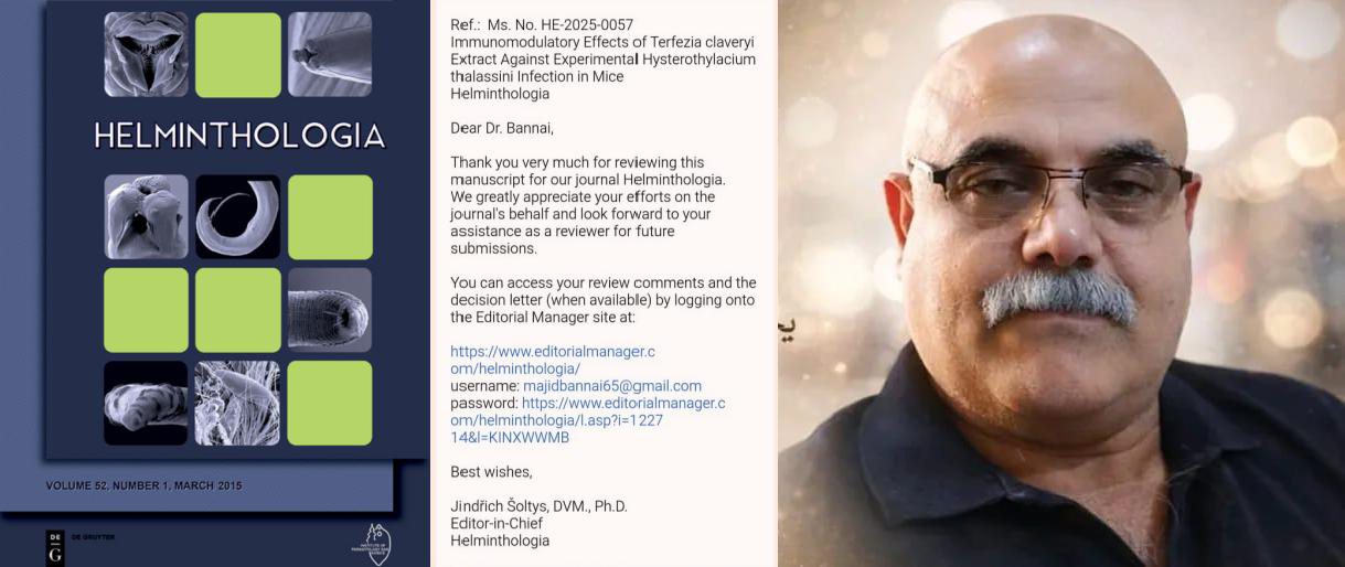 تلقّى Prof. Dr. Majid Abdulaziz Bannai التدريسي في مركز علوم البحار بجامعة البصرة كتاب شكر وتقدير رسمي من هيئة تحرير مجلة Helminthologia، وذلك تقديرًا لمشاركته في تحكيم إحدى الدراسات العلمية المتخصصة في مجال الطفيليات.