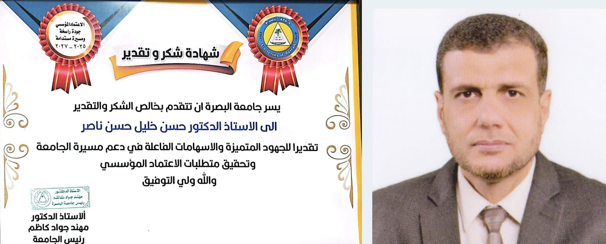 الاستاذ الدكتور حسن خليل حسن مدير شعبة الجودة في مركز علوم البحار يحصد قلادة الاعتماد و شهادة شكر وتقدير في مهرجان الاعتماد المؤسسي الذي نظمته جامعة البصرة في قاعة السياب تقديراً لجهوده المتميزة كأحد مفاصل الجودة على مستوى الجامعة في مجال تطوير الجودة والاعتماد المؤسسي.