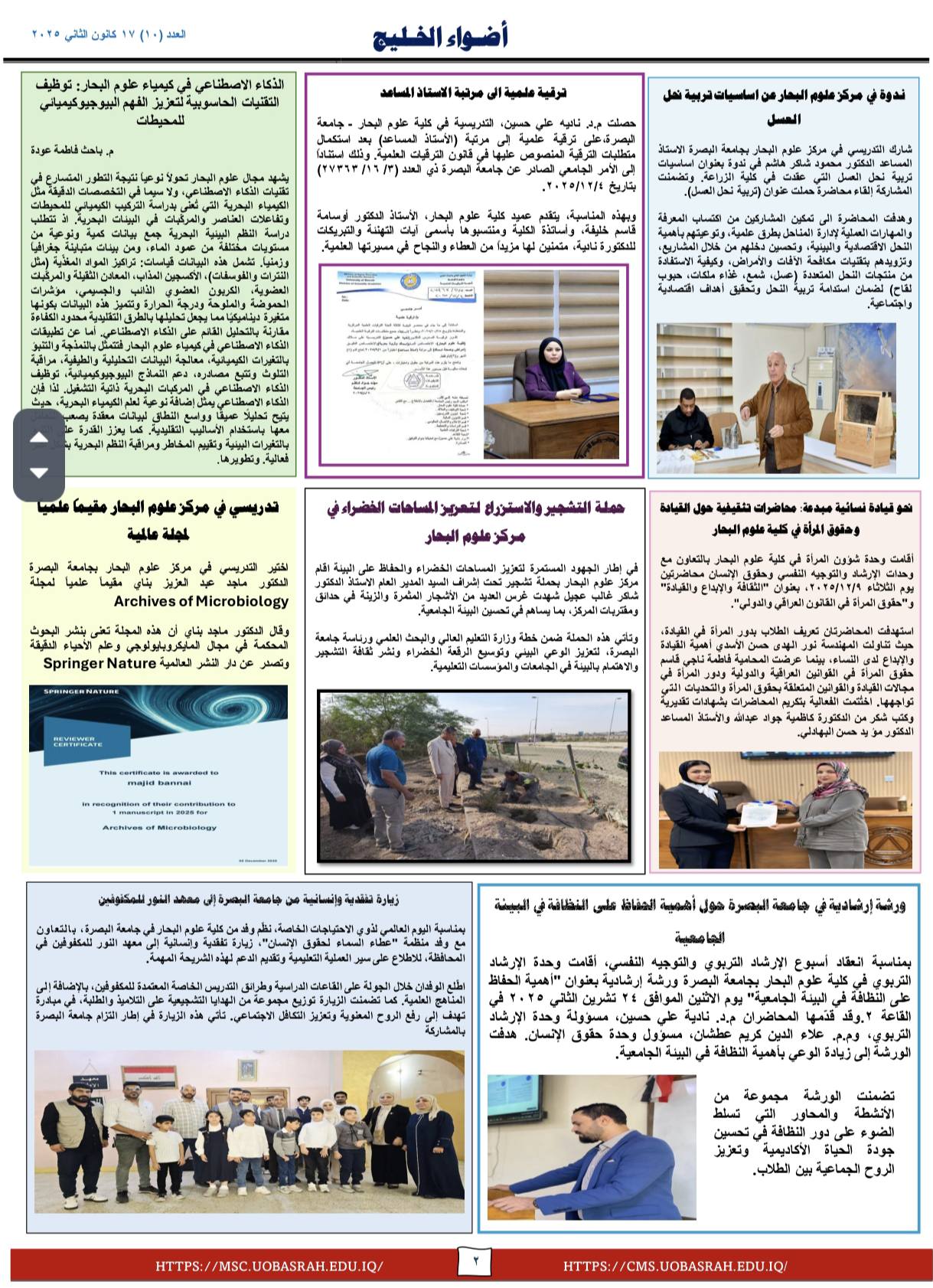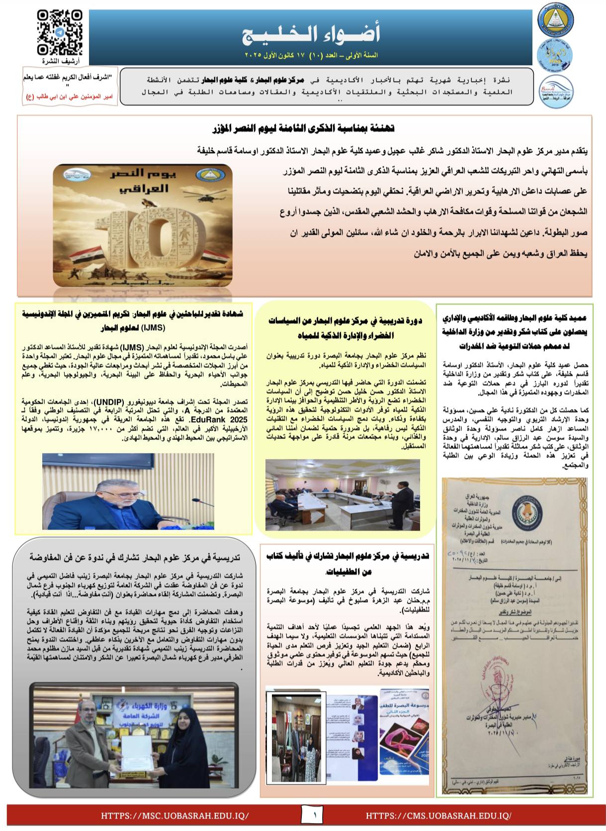 من أجل دعم خطط التنمية المستدامة في الحفاظ على التنوع البحري أصدر مركز علوم البحار وكلية علوم البحار بجامعة البصرة العدد العاشر من النشرة الشهرية " أضواء الخليج ".